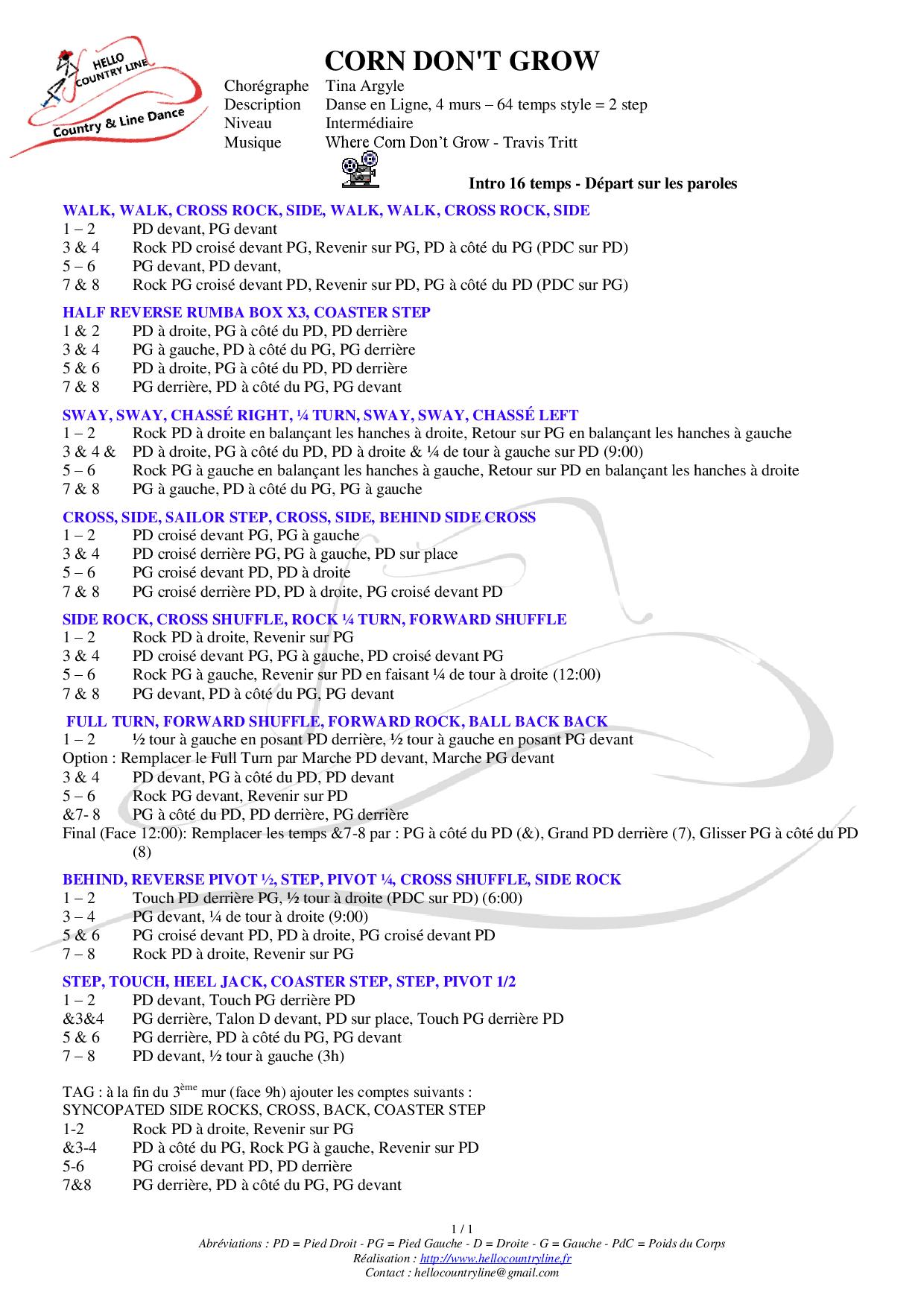 La chorégraphie a été créée par Tina Argyle (2014) sur la musique « Where Corn Don’t Grow » de Travis Tritt.