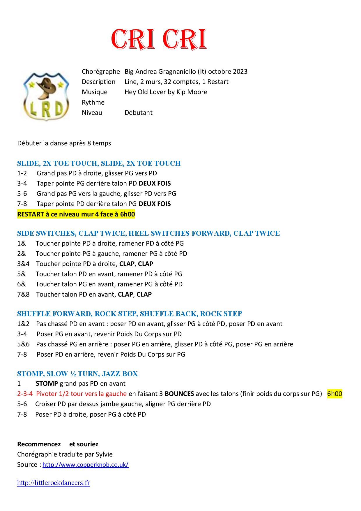 Cri Cri est une danse en ligne country de niveau débutant, composée de 32 comptes et dansée sur 2 murs, avec un restart. Elle a été chorégraphiée par Big Andrea Gragnaniello sur la musique Hey Old Lover de Kip Moore.